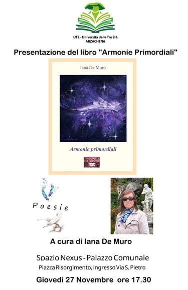 Si preannuncia una serata imperdibile all’insegna della cultura per la presentazione del libro di poesie di Iana De Muro, intitolato "Armonie Primordiali". L'incontro sarà guidato dalla relatrice Marella Giovannelli e vedrà la partecipazione della poetessa Sandra Manca in veste di lettrice.
